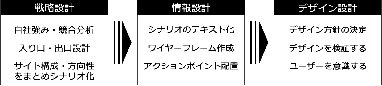 サイトのシナリオ、レイアウト、アクションポイントを効率良く設計することによって、相思相愛のユーザーに訪問してもらい、成果のあがるサイトを構築するお手伝いをいたします。