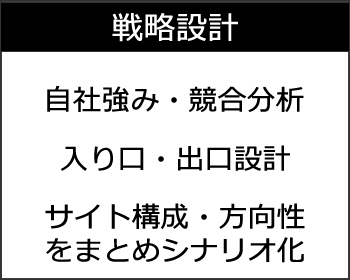 ユーザー目線で市場を分析し、競合他社との比較で課題を抽出、自社の強みを洗い出すことによって様々な切り口でサイト構築の目的を設定していきます。